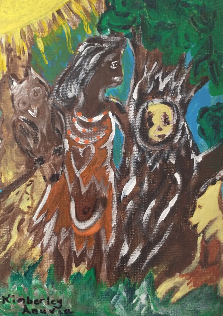 This 5×7” painting began on an interesting note. I decided to pour thin brown paint onto the canvas, and the body of a black woman who is a shaman, instantly formed by itself for me. The Shaman, is here to share wisdom taught to her by the owl and the deer. The message here is the title of the painting, Be the observer like the tree. Tiny little fairies are lounging in the grass, and enjoying the peace that nature brings. The fairies so happily took part in the conveying of this message – we see them in the grass, and in the centre of the tree.