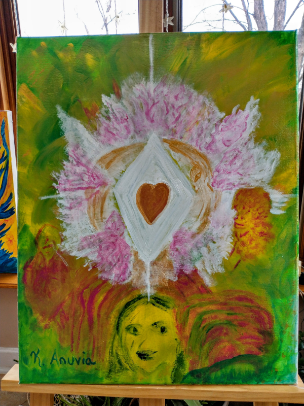 This 16×20” piece is all about the anchoring in of the Diamond Prosperity Codes and our purpose in life. The colours gold and green are very much associated with abundance in all of its forms. Magenta the colour of unconditional love very much wanted to chime in.