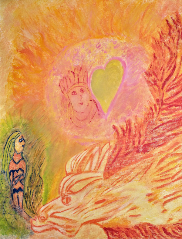 This 16×20” painting is the result of pure co-operation between the Dragons and myself. One sunny day in 2020, I was out walking, and spotted a dragon forming in the clouds. I spoke to it, and told it it looked beautiful. I told it that I would really like to paint it. Do I have your permission, I asked it, and will you show me how? Several hours later, paint brush in hand, I was surprised to see the dragon start to take form as I had put him to the back of my mind. I am very pleased that he showed me how to draw him, as this was the first time ever I had painted a dragon. At the top of the sun, there are turrets of castles that magically appeared. These turrets have shown up several times in drawings of mine, and I have come to know that they are buildings of the city of Atlantis, in the area of Persia.