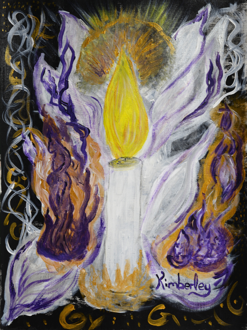 Shortly after painting this piece, I was given the name Kimberley Anuvia in a meditation. A New Via (a new road). The base of the painting is black to symbolize shadow work and starting afresh. This 12×16” piece is all about transformation and rebirth, and adopting a new way of life with fresh perspectives. A wolf started forming on the canvas, as I started to paint. I chose to paint over it, as I felt I needed to draw a candle associated with the angelic beings called the Seraphim. This wolf however, was adamant at showing up in the painting – One can see him on the left hand side at the bottom. He introduced himself as Anubis, the Egyptian God of the dead. An Arcturian being is also seen on the left hand side of this work, above Anubis, as well as many ascended masters and ancestors which are in the candle’s flame.