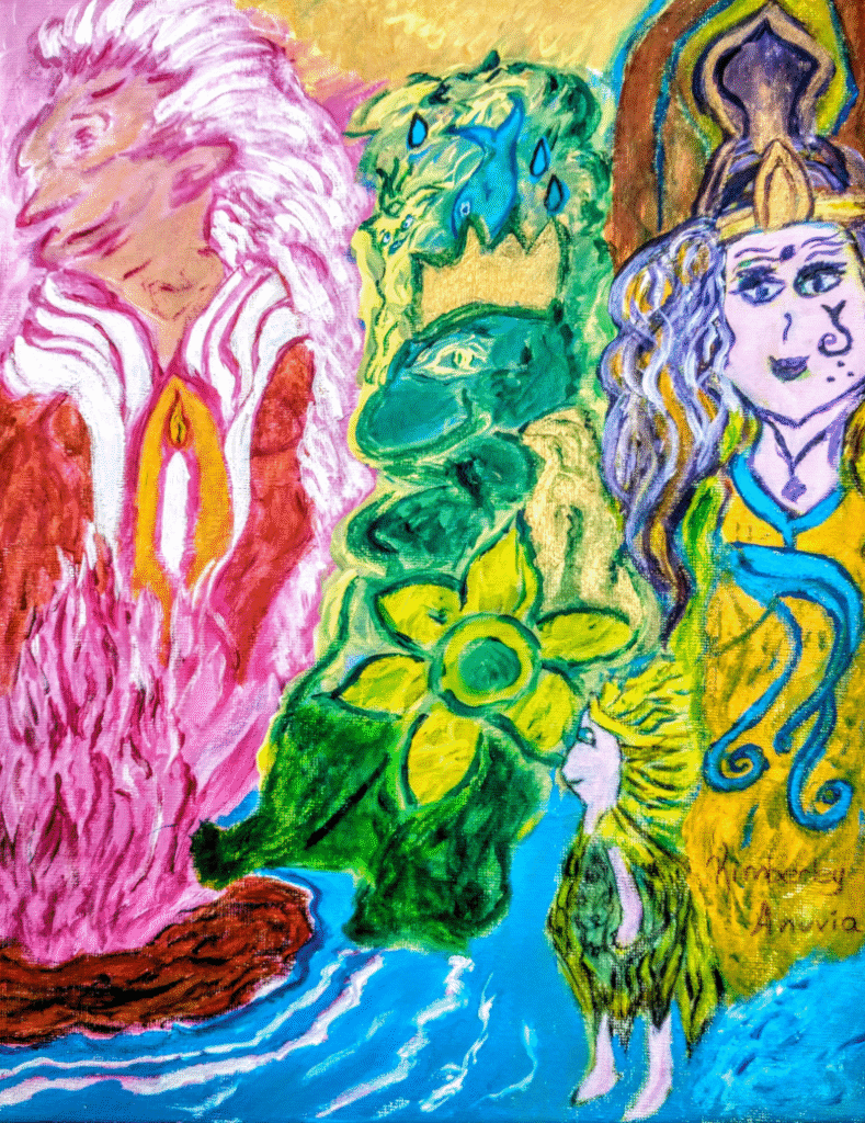 Symbolically, the Frog (in the center of this painting) represents abundance, wealth, wisdom, good luck, renewal and the changing of the seasons. We see the astrological energies of Pisces and Scorpio, as we move into the year of Aquarius, shedding addictions and fears, and learning how to love our shadow-self. The elements of earth, air, fire and wood, are all present, bringing us balance. The Rabbit of 2023 for example, falls under the wood element, with water as the complementary element, it appears in this painting as a sign of prosperity. It’s presence is a reminder to stay ever humble, as humility is a key element in attracting all that is good to us. As it is the 4th sign in the Chinese zodiac, it is also a symbol of stability in all that we do.